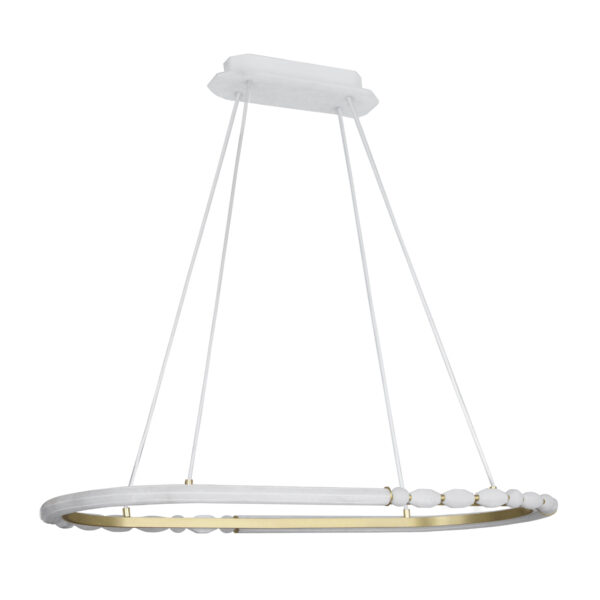 Avec la collection de luminaires Pearl, la créatrice interroge la notion d’équilibre et de légèreté. Elle travaille une asymétrie subtile des pièces. Elle utilise des matériaux nobles et lourds comme la pierre d’albâtre et le métal de Laiton et leur donne des dimensions sculpturales tout en étant très fines et aériennes. Créant un contraste entre formes courbes et structures anguleuses. L’éclairage qui traverse la matière par sa translucidité contribue à interroger la légèreté du volume.